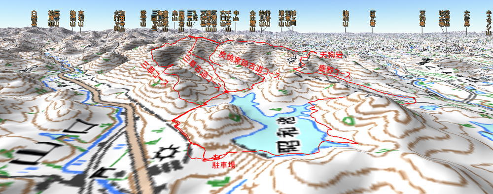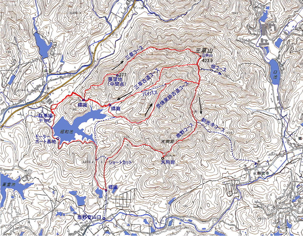 三草山424m 三草コース-三草古道コース(周回) 歩行時間:1時間-50分 歩行距離:2.5km-2.5km 炭焼窯跡古道コース-鹿野コース(周回) 歩行時間:1時間20分-1時間40分 歩行距離:3.2km-4.8km カシバード3D