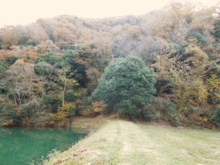 | 9時10分:出発。標高は150m地点である。林道を進むとすぐに明王池。鎌尾根が池に映っている。 | |