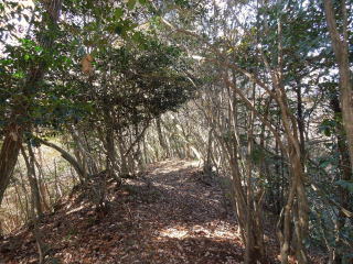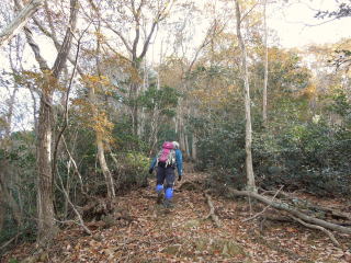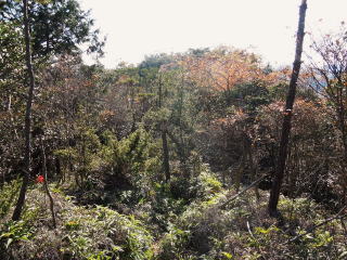 | 落ち葉で踏み跡がはっきりしない急登を20分ほど登っていくと尾根に上る。 普通ならここから快適な尾根歩きになるのだが、今日はシダで踏み跡が隠された道が続く。 |