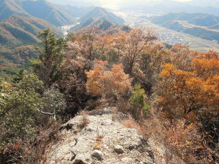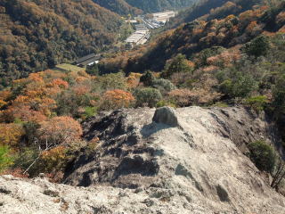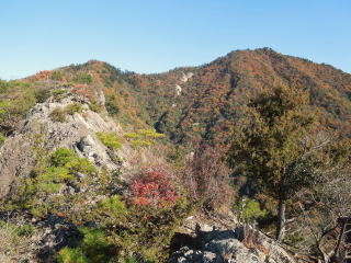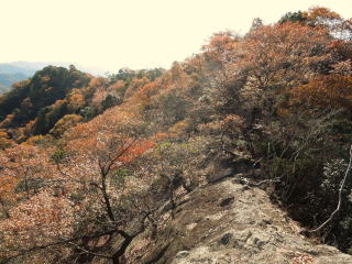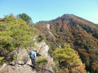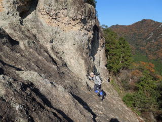 | 尾根の足場は十分にあり、右手は切れ落ちているが左手はなだらかなので問題なく歩ける。 15分ほど岩尾根を進むと、高低差が30mほどある岩壁に突き当たるが、ここも足場がしっかり確保できる ので問題なく登れた。 |