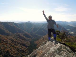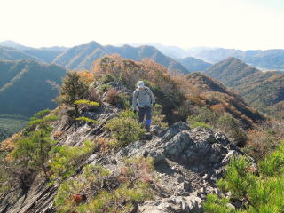 | 地獄鎌尾根、西尾根とも落葉樹が多いので気持ちよく歩け、時々シダで踏み跡が隠された所で戸惑うが、 目印のテープを探しながら歩けば迷うことはない。 登り約3km、下り約3,3lmの、,鎌尾根やゴリラ岩など変化に富んだ岩場が続く面白いコースだった。 |