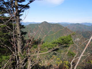 | 左手に下山予定の西尾根と、大きく尾根を広げている明神山を見ながら歩いて行く。 | |