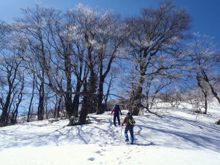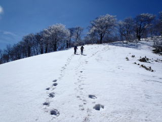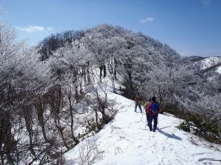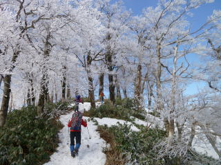 | 白馬山から毛無山に向かって歩いて行くと、次第に樹々が白くなってき、待望していた樹氷ロードになった。 雪が薄いのでツボ足で問題なく歩ける。 |