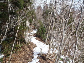 | 40分ほど登るとようやく雪道になった。ヤレヤレ。 | |