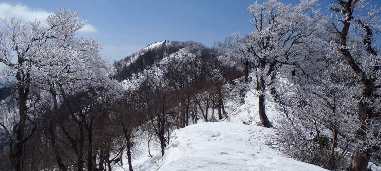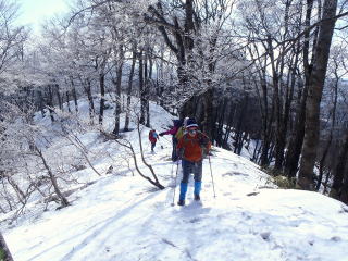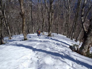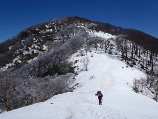 | 前方に毛無山を見ながら、雪庇の張り出したヤセ尾根を歩いていく。 | |