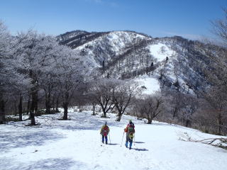 | 山頂から西毛無山を見ると、雪は十分残っているのでそちらへ回ることにした。12時:出発。 | |