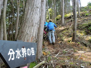 | 15分で天王坂に着き、取り付くと、「分水界の径」の標識が立てられていた。 | |