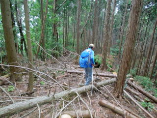 | 譲葉山を過ぎると、踏み跡が不明瞭になり、倒木で阻まれたりで、GPSに入れてきたルートを辿りながら 進んでいったが、GPSなしでは危険なルートだと思った。 |