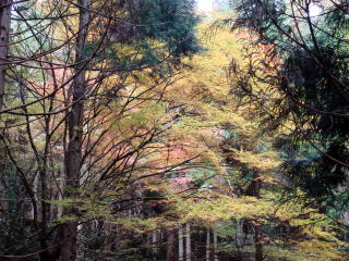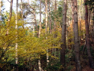 | 沢筋の緩やかな登りをしばらく歩く。 この間、ところどころに紅葉が現れる。 |