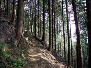 | 30分ほど歩くと沢筋から離れ少し急登な杉檜林になり、15分ほどで稜線に出る。 少し落葉樹が現れるが後は頂上まで杉檜の植樹林が続く。 |