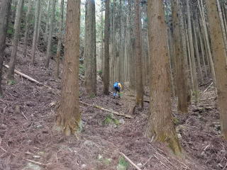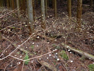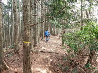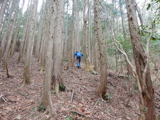 | 杉林をミツマタの群生地まで歩いて行くと、このままでは谷に入り込むので左手の尾根に取り付く。 尾根に上がると明るい自然林が続き、ここで漸くルートに乗る。 |