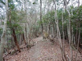 | 最初は左側が植樹林で右側が自然林の尾根がつづき、途中から自然林になる。 | |