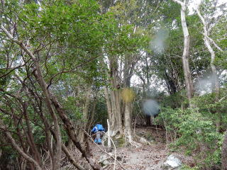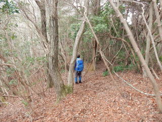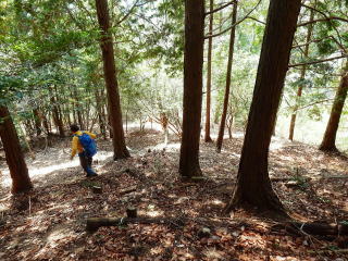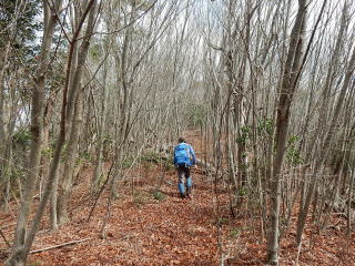| 約1時間で主稜線に乗る。標高は480m程なので高低差はまだ200mあり、そこそこの斜度がある尾根を登っていく。 登山道がない尾根の最後は、GPSを見ながら山頂に向かって左手に進んでいく。 |