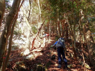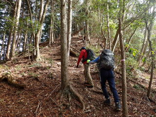 13時10分:東尾根から下山開始。落葉でフワフワになった急坂を下る。気持ちいい。