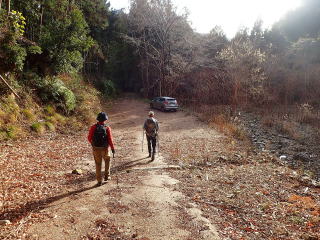 9時30分:駐車場を出発し、林道を少し歩く。 標高は約300m地点。