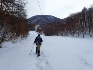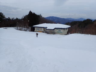 | 5〜6分歩くとスキー場に入り、休業中で静まりかえったゲレンデを登っていく。 | |