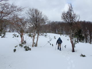 | 東登山口のある林道をショートカットして尾根歩きを続け、14時30分、尻セードで林道に降りる。 | |