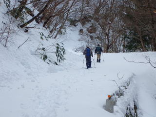 | 標高約1030m辺りまで薄暗い檜林の道が続き、時折頭上から落下してくる雪爆弾が怖い。 | |
