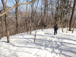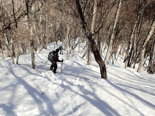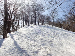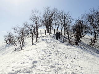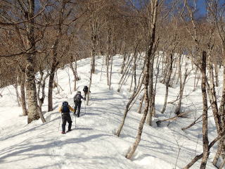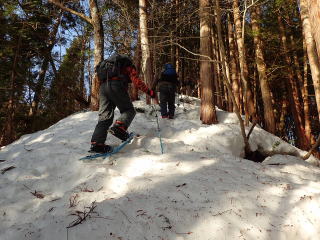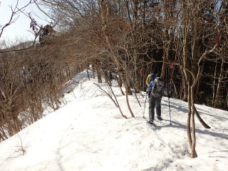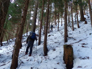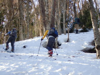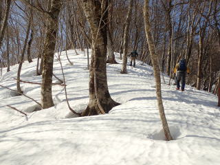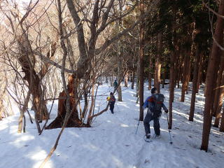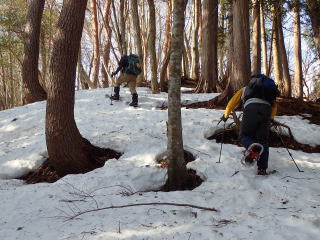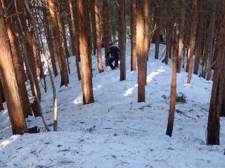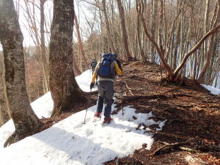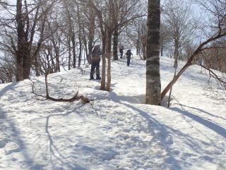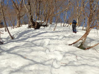 | 13時30分:最後の急坂を下降。積雪が少なくなっていて滑りやすくて歩きにくい。 | |
