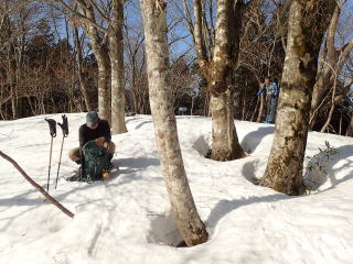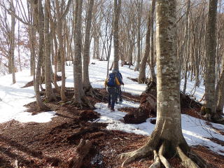 | 杉林が落葉樹林に変わると、日当たりのいいところは融雪が進み地肌が見えていた。 8日の降雪以降雪は降っていなくて、この数日春の陽気になったので一気に雪解けしたようだ。 |