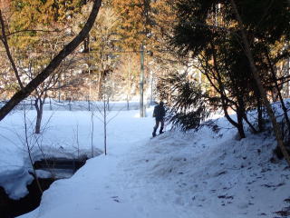 | 昨日大勢の人が歩いたのか、ふみ跡でボコボコになった雪面を踏ん張っていく。 | |