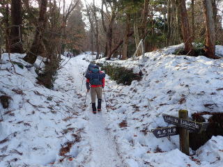 | 8時40分:夏道登山口に入ると、最初から雪道。分岐付近でアイゼンを装着するとやはり歩きやすい。 | |
