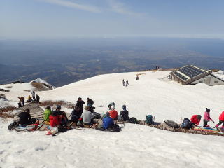 | 8合目。木道は完全に露出している。雪面を歩くと融雪して歯が効かず体力消耗。。 | |