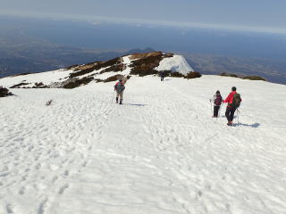 | 温暖な日が続いているので雪面はボコボコしている。 10時15分:5合目に到着。 | |