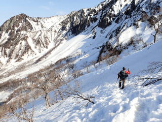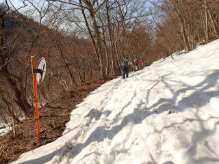 | 急傾斜になるが、ボコボコ雪もアイゼンが効いているのでそんなに苦にならない。 | |