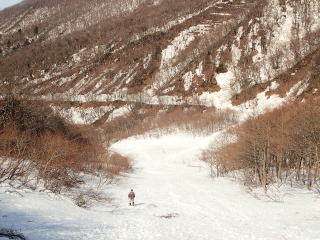 | 14時15分:6合目から行者谷に踏み入れ、脛まで嵌まり込みながら下っていく。 | |
