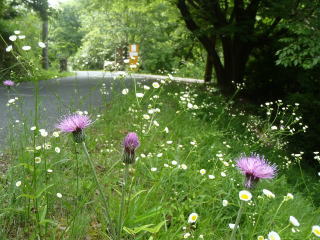 | 7時55分:駐車場を出発。 ノアザミとヒメジョオン咲く舗装路を歩いていく | |||