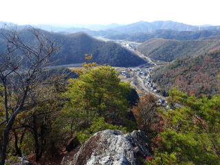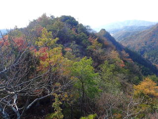 | 天狗岳から南側に県道44号線沿いが見渡せた。小休止後、前方に見える目的地の高巖山に向かう。 | |