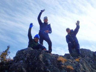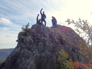 | 南側から見るととても登れないように見えたが、北側に回ると何とか登れそう。 一番若くて元気のあるTR君がいきなり登りはじめ、あっという間に岩の上に上がった。 もうあとに続くしかないと、全員岩峰に上がる。 下降も手掛かり足掛かりがしっかりしているので問題なく降りれた。 |