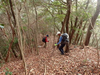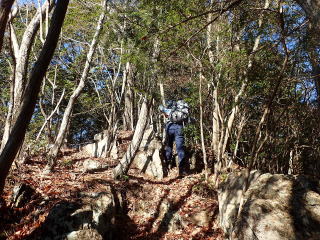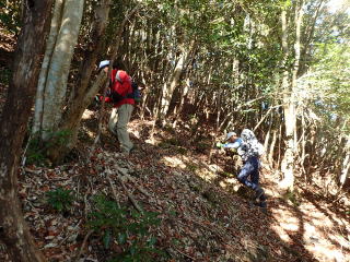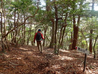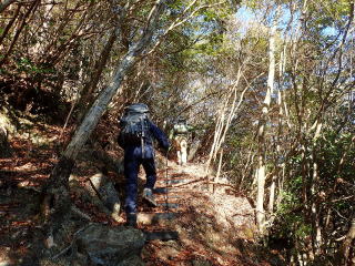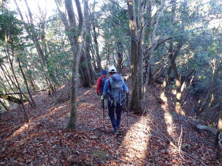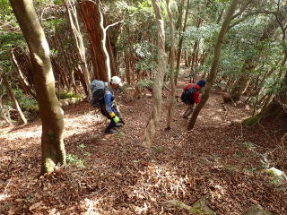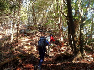 13時10分:東尾根から下山開始。落葉でフワフワになった急坂を下る。気持ちいい。