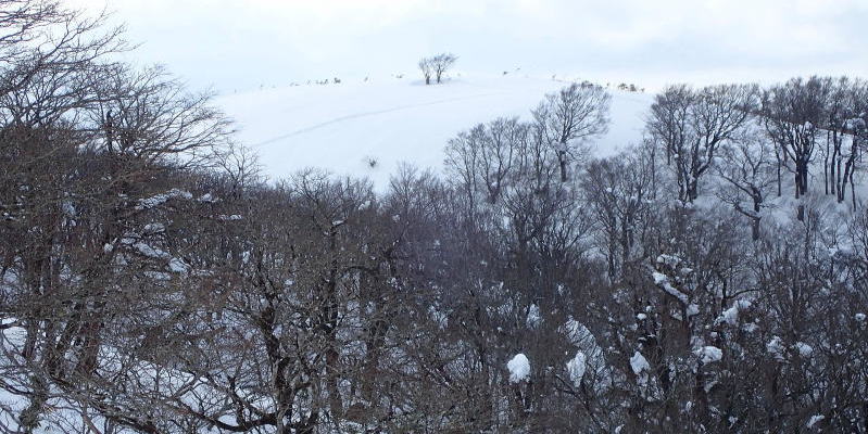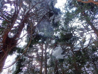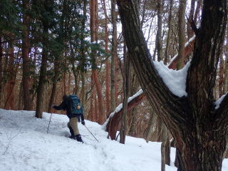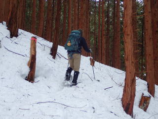 | 標高約1030m辺りまで薄暗い檜林の道が続き、時折頭上から落下してくる雪爆弾が怖い。 | |