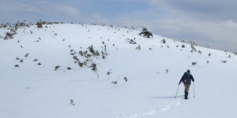 | 5〜6分歩くとスキー場に入り、休業中で静まりかえったゲレンデを登っていく。 | |