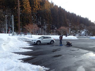 | 同行者は、FM君、UK君とTR君。 朝6時に高砂を出発し、7時半頃駐車場に到着すると、良く除雪された駐車場は空っぽだった。 8時:雪支度をして出発。今日は駐車場裏から取り付くので最初からルノーシューを装着。 |
