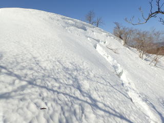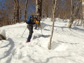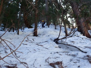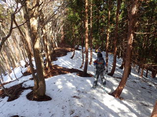 | 13時30分:最後の急坂を下降。積雪が少なくなっていて滑りやすくて歩きにくい。 | |