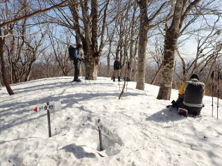 | 杉林が落葉樹林に変わると、日当たりのいいところは融雪が進み地肌が見えていた。 8日の降雪以降雪は降っていなくて、この数日春の陽気になったので一気に雪解けしたようだ。 |