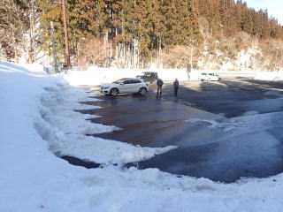 | 昨日大勢の人が歩いたのか、ふみ跡でボコボコになった雪面を踏ん張っていく。 | |